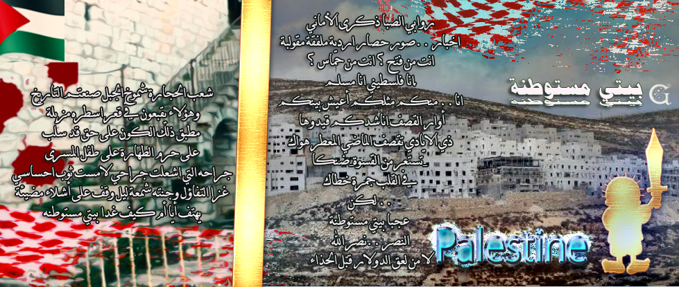 انا فلسطيني انا مسلم, انا.. منكم مثلكم أعيش بينكم أوار القصف اناشدكم قيدوها ذي الايادي تقصف الماضي المعطر هواك تستعر من القسوة_ضنكا_ في القلب جمرة خطاك لكن .. عجبا بيتي مستوطنة ! النصر ..نصر الله لا من لعق الدولار قبّل الحذاء شعب الحجارة شموخ الجبل صنعتم التاريخ وهؤلاء يقبعون في قعر اسطره مزبلة مطبق ذلك الكون على حق قد سلب على حرم الطهارة على طفل المسرى جراحه التي اشعلت جراحي لامست ثوب احساسي غزا التفاؤل وجنته شمعة ليل وقف على أشلاء مضيئة يهتف أيا أم كيف غدا بيتي مستوطنه ! |